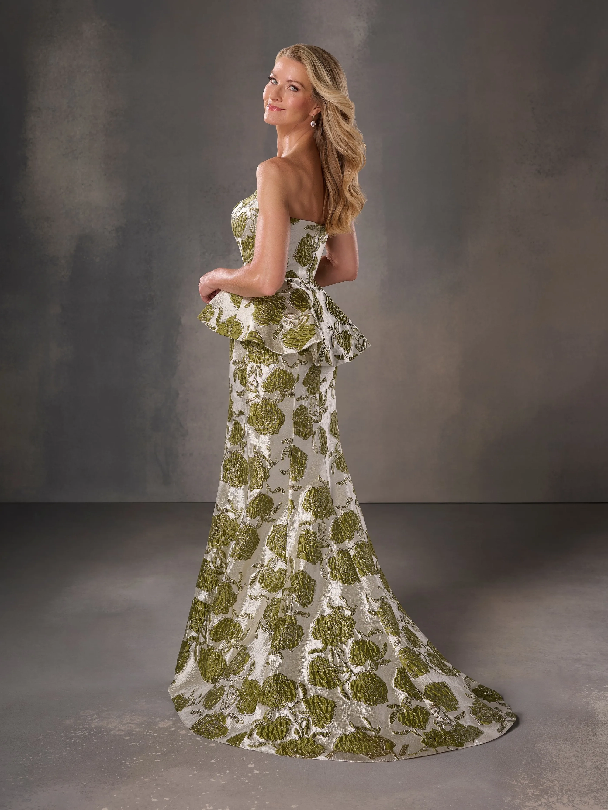 Strapless floral brocade peplum fit & flare gown with chiffon shawl.